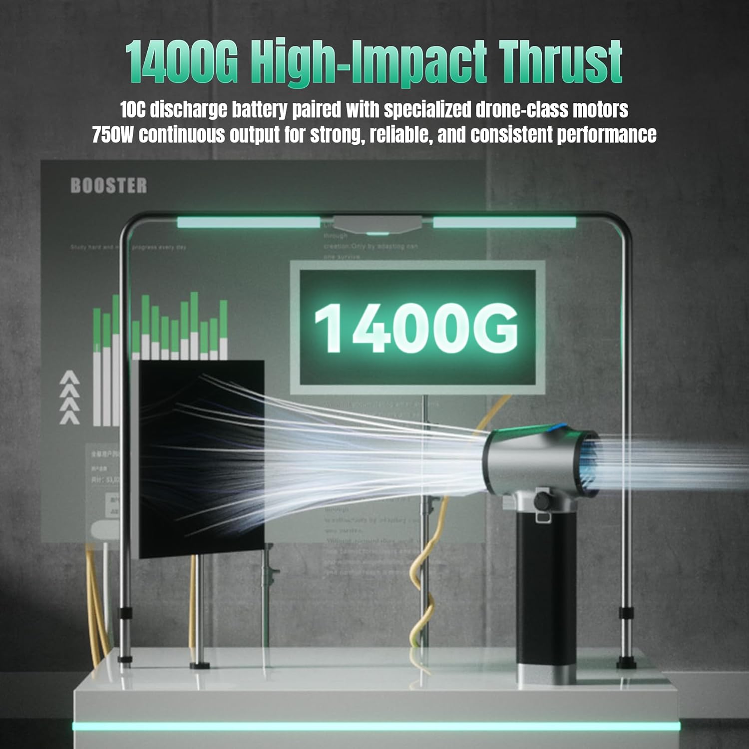 Experience powerful, flexible, and portable cleaning performance with this cordless turbo air blower. Designed for car owners, DIY enthusiasts, and outdoor users, it delivers exceptional airflow through a 64mm large-diameter brushless motor and optimized air channel structure. The turbo function unleashes a peak wind speed of 60 m/s and 330 CFM airflow—ideal for removing water, leaves, dust, and debris in seconds. The infinitely adjustable speed dial allows precise control, switching smoothly between light dusting and full-power blowing within one second. Its built-in 4000mAh battery supports up to 80 minutes of use, making it reliable for automotive detailing, yard cleaning, snow clearing, BBQ lighting, and workshop tasks. A silicone-wrapped handle reduces vibration and ensures a secure, comfortable grip during extended operation. The smart colored energy light provides real-time power feedback and indicates turbo mode status, ensuring safe and efficient use. Each package includes a turbo blower, DC charger, and English user manual.